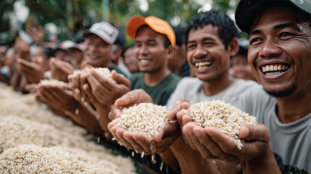 A lively scene depicting joyful farmers in a rural setting celebrating a successful rice harvest. Their hands are filled with fresh grains, showcasing their hard work and dedication. The image captures the essence of community spirit, agricultural tradition, and the beauty of nature.