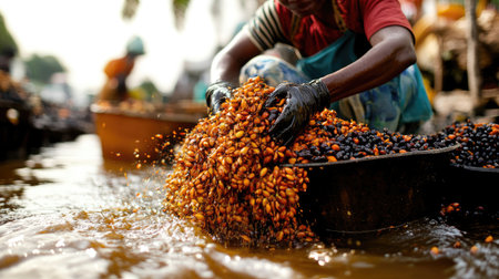 A dedicated woman skillfully gathers fresh oil palm fruits in a lively market, showcasing essential agricultural practices under golden sunlight.