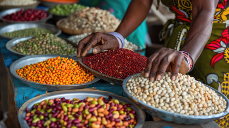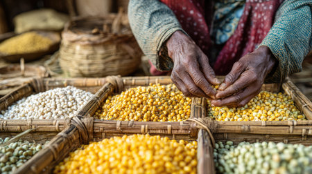 An intimate scene capturing hands sorting vibrant legumes within a traditional marketplace. The arrangement of grains in woven baskets showcases local agriculture and artisan craftsmanship, highlighting cultural practices and the connection to natural, fresh food sources.