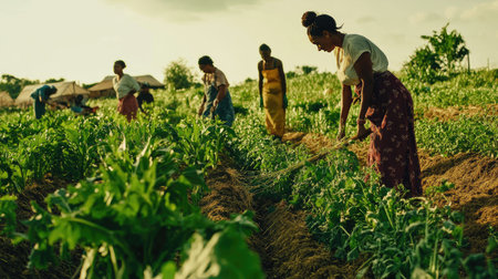 Women engaged in planting seedlings in a vibrant field, demonstrating hard work and collaboration in agriculture, surrounded by lush greenery and a clear sky