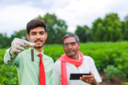 young indian handsome agronomist with test tube and tablet