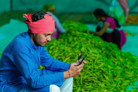 Young indian farmer using smartphone and card at green chilly field