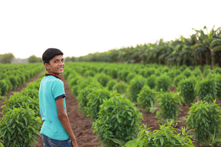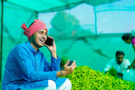 Young indian farmer talking on smartphone at green chilly field