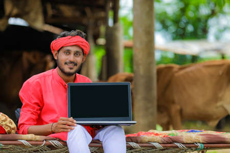 technology concept : Young indian farmer using laptop at home