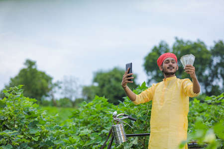 Indian farmer take selfie with money at cotton field and showing happy expression