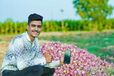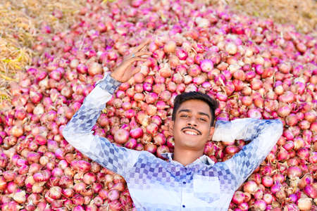 Young Indian farmer holding an onion in hand at agriculture field