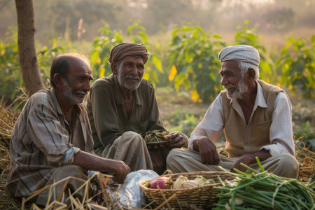 Three farmers in a field sorting harvested crops and having a conversation