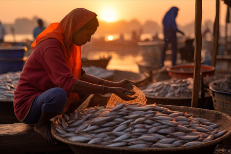 Fishermen sorting out and selling fish by a shore at dawn