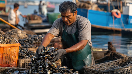 A fisherman harvesting mussels from aquaculture ropes, preparing them for sale in seafood markets