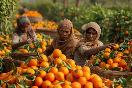 Female farmers in india harvest oranges in a sunny orchard, filling wicker baskets with ripe fruits under blue skies, creating a vibrant rural scene