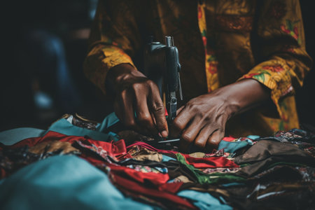 Person operating an industrial sewing machine with blue fabric