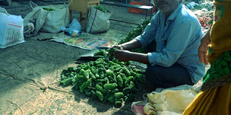 DISTRICT KATNI, INDIA - AUGUST 04, 2019:A fresh vegetable slicing for sell by village poor man in biggest outdoor marketplaces offers a wide natural variety of foods and merchandise.