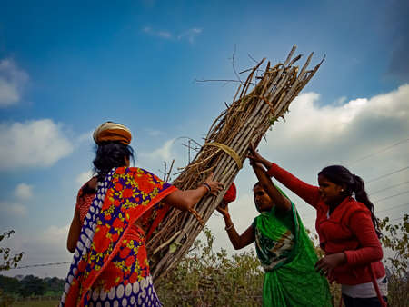 DISTRICT KATNI, INDIA - JANUARY 01, 2020: Three indian village female labours picking wooden fire sticks for transportation on forest area at blue sky background.