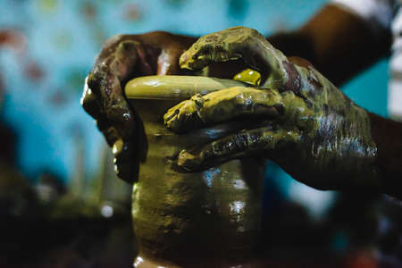 Close-up hands of a male potter. Artist is making a vase from clay, selective focus.