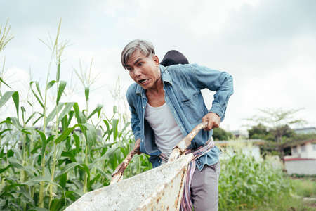 Asian elderly senior farmer walking with wheelbarrow cart in a field.