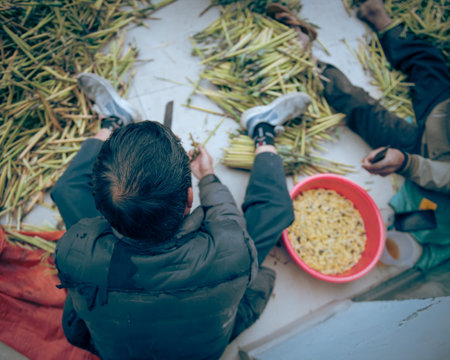 Top view men using sharp knife to split Tiger grass to harvesting Crambid Moth or Brihaspa atrostigmella, special medicine, food source from Northwest, Vietnam.