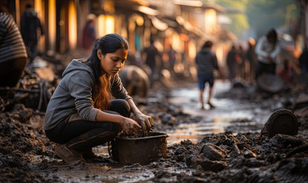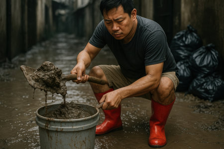 Man in red boots cleaning muddy street alley by shoveling wet debris into bucket in the aftermath of urban flooding and disaster.