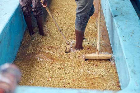 African workers are washing coffee at production center