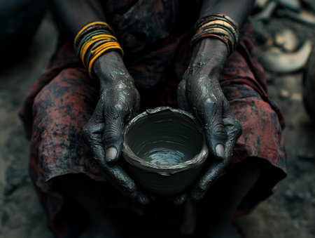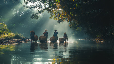 People gather in a serene rural setting, exchanging clay pots filled with water. Vibrant clothing reflects cultural heritage as they engage joyfully in a time-honored festival.