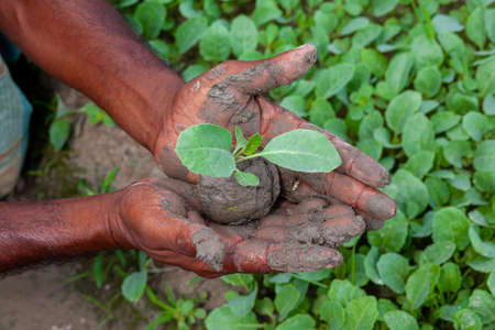 Two muddy hands are holding a small green plant. Plant in hands. Green plant background. Life and Savings concept.