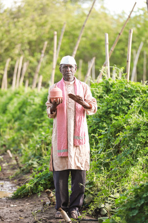Indian farmer Holding gullak in hand, saving concept, happy poor farmer