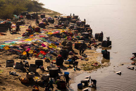 Agra, Uttar Pradesh - 28 January 2022- An aerial view of a dhobi ghat based in agra. People washing clothes in a dhobi ghat.