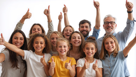 A joyful multigenerational family, including children and adults, smiling and giving thumbs up together in a group photo.