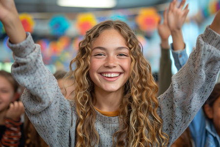 A young girl with blonde hair smiles and raises her hands in a classroom full of students.