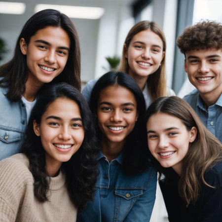 Global smiles: capturing joy in group selfies of cheerful and happy young people diverse nationalities, celebrating unity, friendship, cultural harmony in shared moments of happiness and togetherness