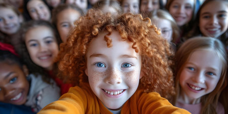 Class selfie in an elementary school. Kids taking a picture together in a co-ed school in a classroom. AI Generated.
