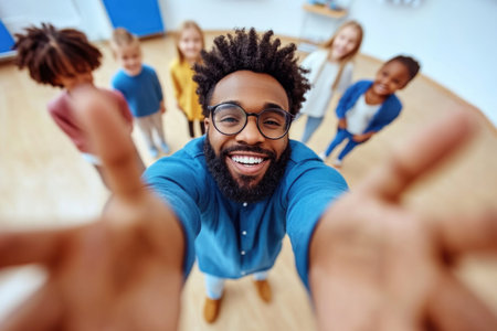 Smiling young male teacher snaps a selfie with happy students in a sunny classroom, capturing joy, connection, and modern education.
