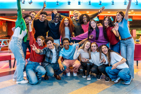 Cheerful multi ethnic group of young students enjoying a weekend together at the bowling alley, playing arcade games and billiards