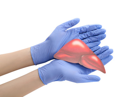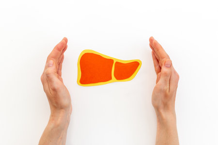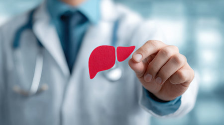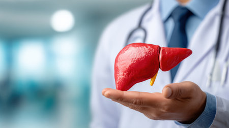 Doctor holds a red liver cutout to teach about liver health and disease prevention in a clinical environment.