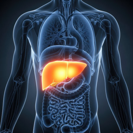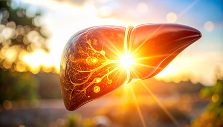 3D illustration of a human liver with visible blood vessels illuminated by sun rays.