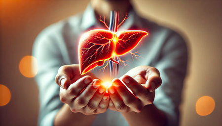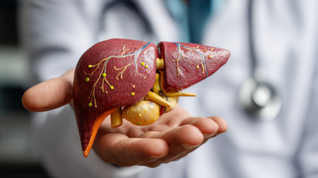 A detailed 3D-rendered human liver held in hands, symbolizing liver health, medical science, organ donation, detoxification, and healthcare awareness
