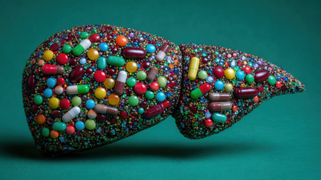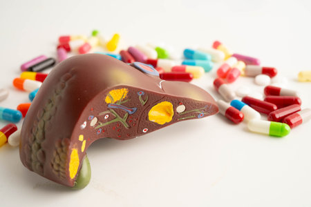 A liver model made of colorful materials shows various pill representations symbolizing treatment for liver diseases.