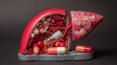 A liver model displays cirrhosis and liver cancer with pills representing drug treatment for various liver conditions.