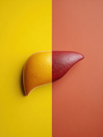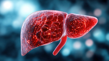 A highly detailed representation of a human liver in red hues, highlighting its structure against a blurred, colorful background. It emphasizes the organ's vital role in the body.