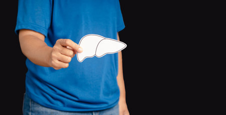 Close-up of hand holding a liver shape symbol while standing on a black background. Medical and healthcare concept. Close-up photo
