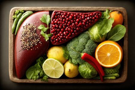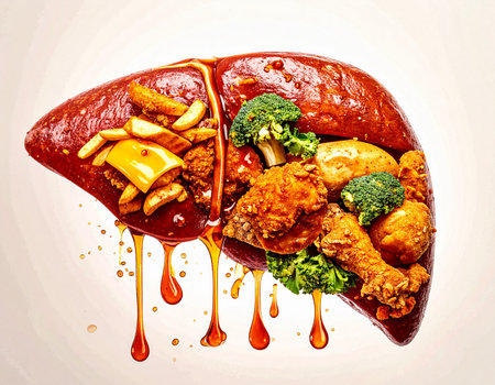A realistic depiction of a human liver stuffed with fried chicken broccoli and other unhealthy foods, with grease dripping from it.