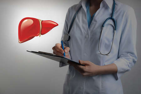 Doctor with clipboard and illustration of healthy liver on light gray background, closeup