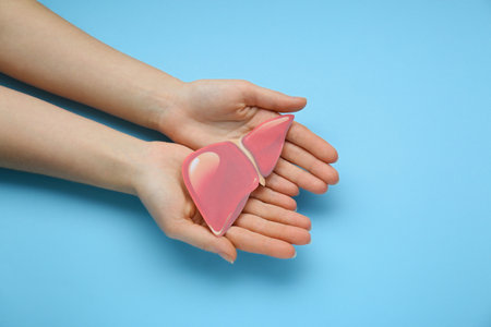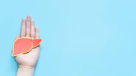 Healthy liver. Human hand holding liver symbol on light blue background with copy space. Health care and medical concept.