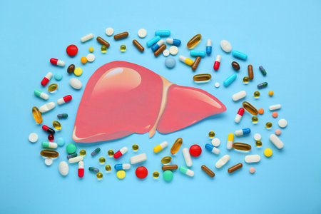 Paper liver and pills on light blue background, flat lay. Hepatitis treatment