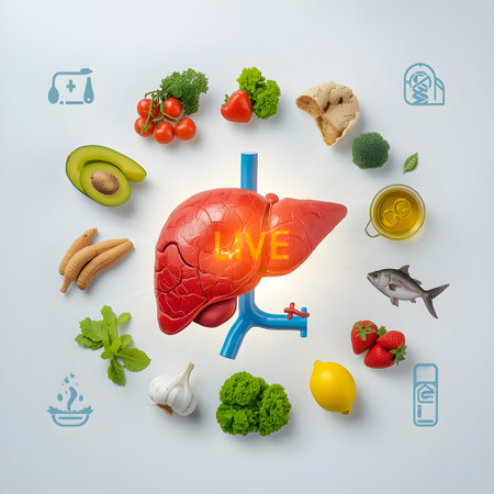 Bright banner showing liver shapes with fruit slices and green leaves highlighting liver detox prevention and health awareness.