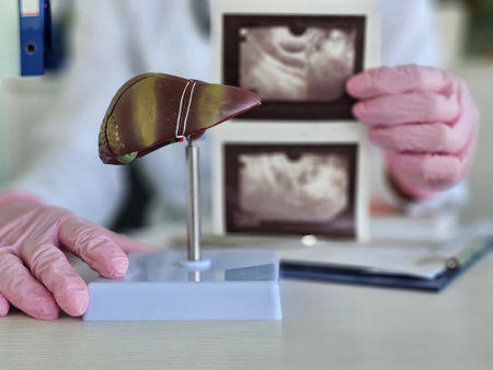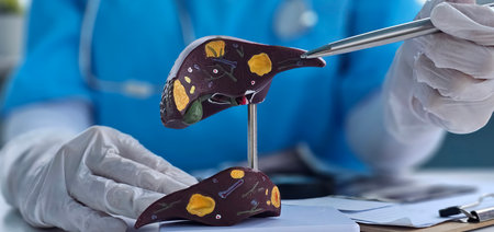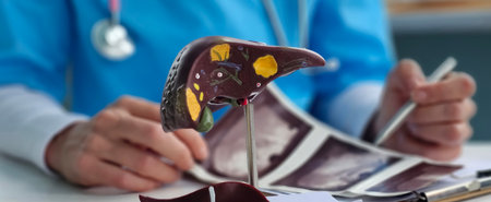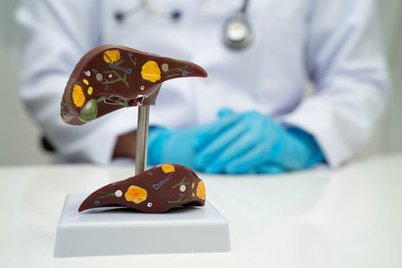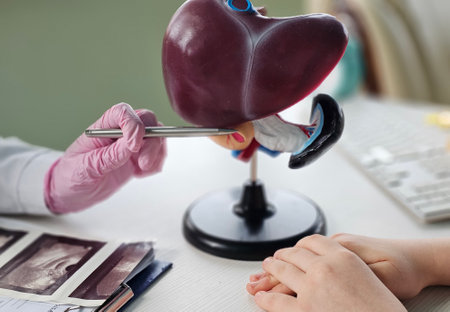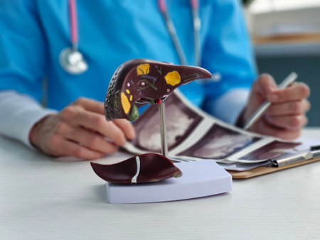 Doctor shows human liver model to explain cirrhosis and liver cancer in a medical office during a consultation.