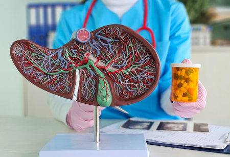 healthcare professional showcases a liver model highlighting its intricate structure and blood vessels while holding a container of medications