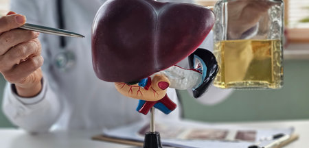 Alcoholic liver damage and liver cirrhosis concept with liver and alcohol. Cirrhosis by alcoholism hepatitis B or C or non-alcoholic fatty liver disease