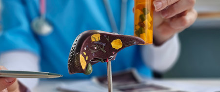 Model of liver and doctor holding pills