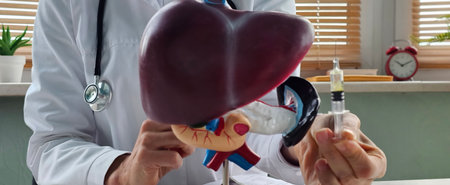 Doctor explains cirrhosis and liver cancer holding a model of human liver anatomy in a medical clinic.