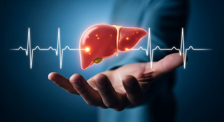 The a hand holding a 3D model of a liver, which is glowing with red and orange highlights. The liver model is detailed and appears to be floating above the hand. In the background, there are white heartbeat lines, symbolizing vital signs and medical monitoring. The overall setting is digital and abstract, with a blue background that enhances the focus on the liver model and the heartbeat lines. The conveys a concept related to healthcare, medical technology, and the importance of organ health.